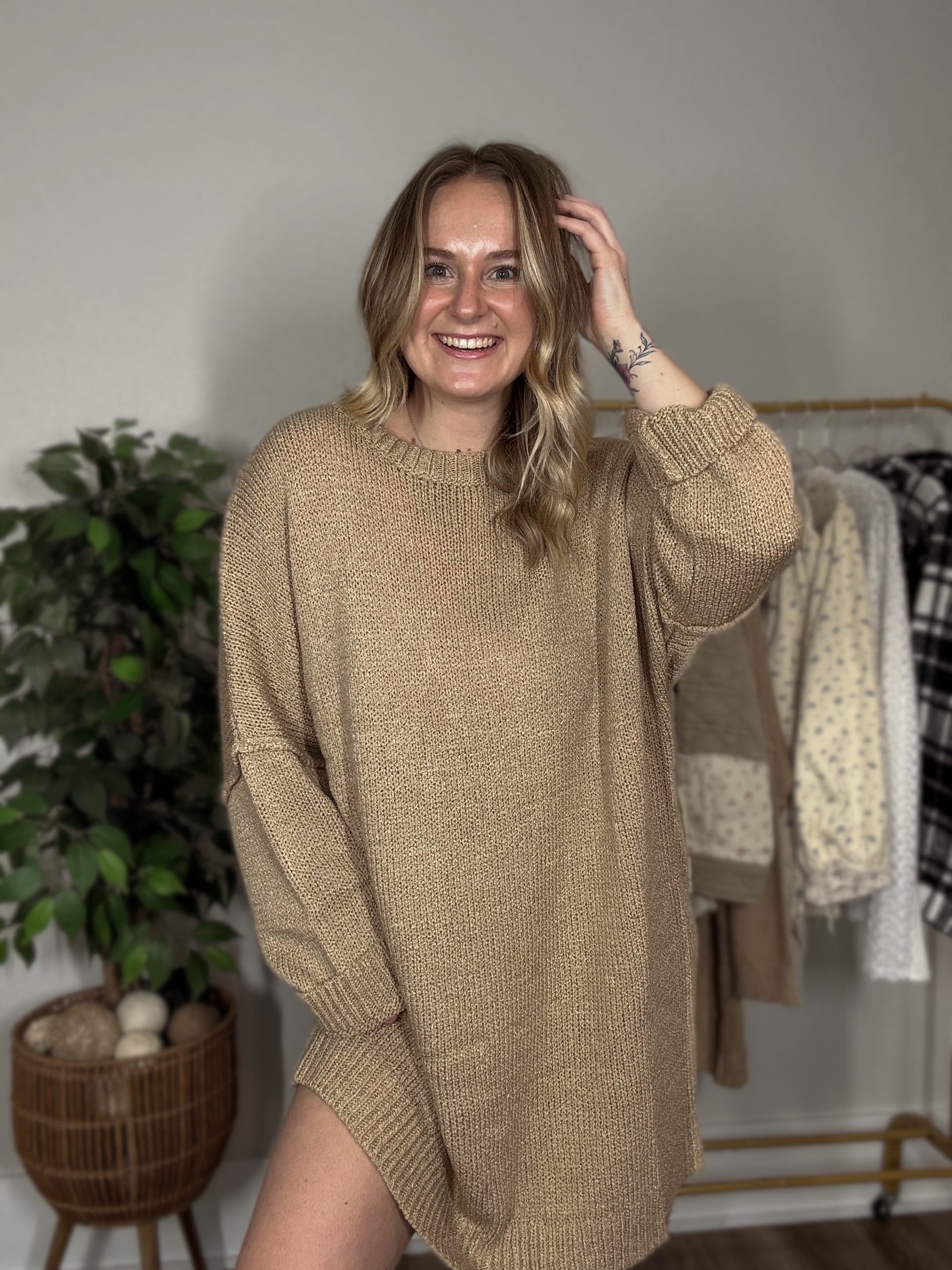 Meet your new chilly-day obsession. This oversized khaki sweater dress is the perfect blend of comfy and cute. Designed with a relaxed fit, soft knit fabric, and long sleeves for extra warmth, it’s made for effortless fall and winter styling. Wear it solo with boots for a cozy chic look, or pair it with leggings for laid-back comfort. The neutral khaki tone keeps it earthy and feminine, making it easy to dress up or down. Whether you’re heading to brunch, lounging at home, or strolling the pumpkin patch, this sweater dress is the definition of snuggly boho vibes.
